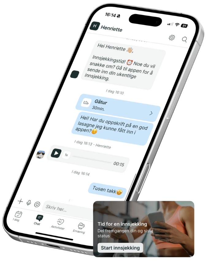 Du står aldri alene. Med ukentlige videoinnsjekk og tilgang til meg på chat, får du støtte, svar og justeringer når du trenger det – enten det handler om motivasjon, spørsmål eller å tilpasse planen underveis.