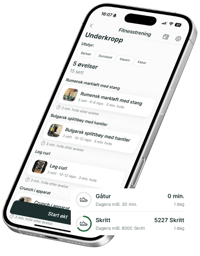Nøkkelen til fremgang er en plan som passer inn i livet ditt. Derfor lager jeg et treningsprogram som tar hensyn til deg og din variable hverdag som turnusarbeider.